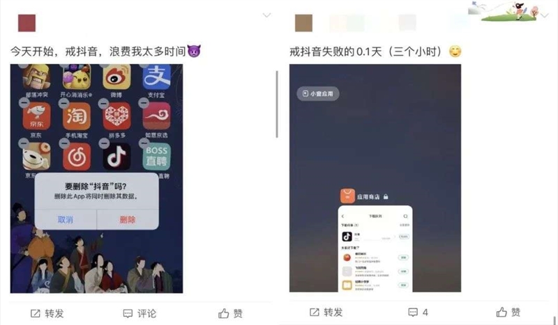 时至今日,在微博、知乎、豆瓣甚至抖音上,轻易就能搜到大量“戒抖音”的打卡贴、求助帖。在这些帖子的评论区,“希望早日戒掉抖音”,是年轻人对彼此最真挚的祝福。