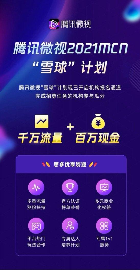腾讯微视日前宣布,针对MCN机构推出2021MCN“雪球”计划,以千万流量、百万现金、优享资源三大形式邀请MCN机构招募更多优质创作者加入腾讯微视,并帮助其快速成长为创作达人。