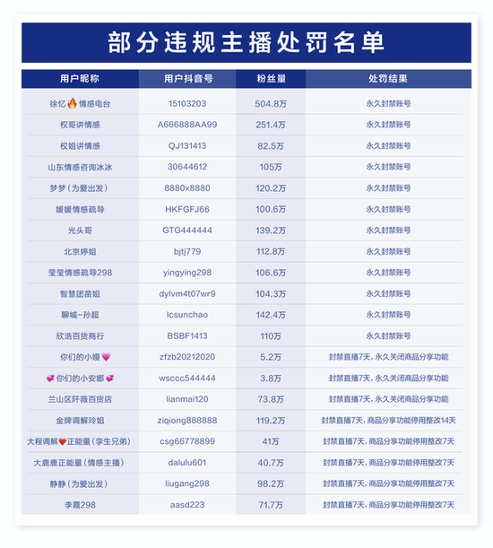 公告称,平台已对卖惨带货、编造离奇故事、演戏炒作等行为进行违规处罚。近30天内,平台共处理相关违规直播间446个,封禁违规账号33个,包含 “徐忆情感电台 ”、“权哥讲情感”、“光头哥”等10个粉丝超百万主播,另有 “金牌调解玲姐”等多位主播被封禁直播权限。