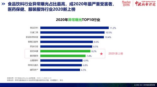 具体到不同行业,食品饮料行业异常曝光占比为11.2%,成为2020年度最严重受害者。交通工具、家装家具家居紧随其后,异常曝光占比分别为10.5%及10.4%。另外,医药保健及服装服饰行业为2020年新上榜。不同行业中,异常点击最多的为交通工具,占比13.5%,该行业为2020新上榜。