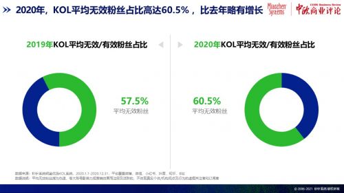 据秒针系统SocialMaster及明鉴优选KOL系统数据,2020年,主流社交平台的整体异常流量占比为51%,KOL的平均无效粉丝高达60.5%,社交流量造假现象进一步恶化。此外,KOL有效粉丝率与KOL级别呈现负相关趋势,头部KOL的含水量相对更高。