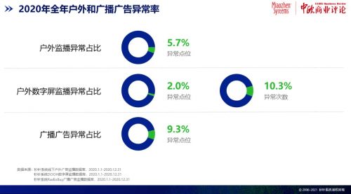 根据秒针系统线下户外广告监播数据库、秒针系统DOOH数字屏监播数据库及秒针系统RadioBuy广播广告监播数据库,2020年户外监播异常占比5.7%;户外数字屏异常点位占比2.0%,为漏上刊情况,次数漏播率达10.3%,点位多播情况较为突出,高达99.7%;广播广告异常占比为9.3%。
