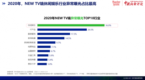 2020年,NEW TV异常流量占比为5.9%,较去年有所好转。按广告位类型看,开机(9.4%)、视频贴片(8.6%)异常曝光占比接近。按行业来看,NEW TV端异常曝光占比较高的前三个行业为休闲娱乐、IT产品、服装服饰等居民日常消费领域。