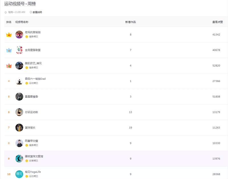 目前,视频号上头部体育运动类账号也是主要以健身瑜伽为主。根据第三方平台友望数据显示,体育排行榜周榜和月榜排名前十的TOP10的博主基本上发布的内容都是跟瑜伽、健身有关。