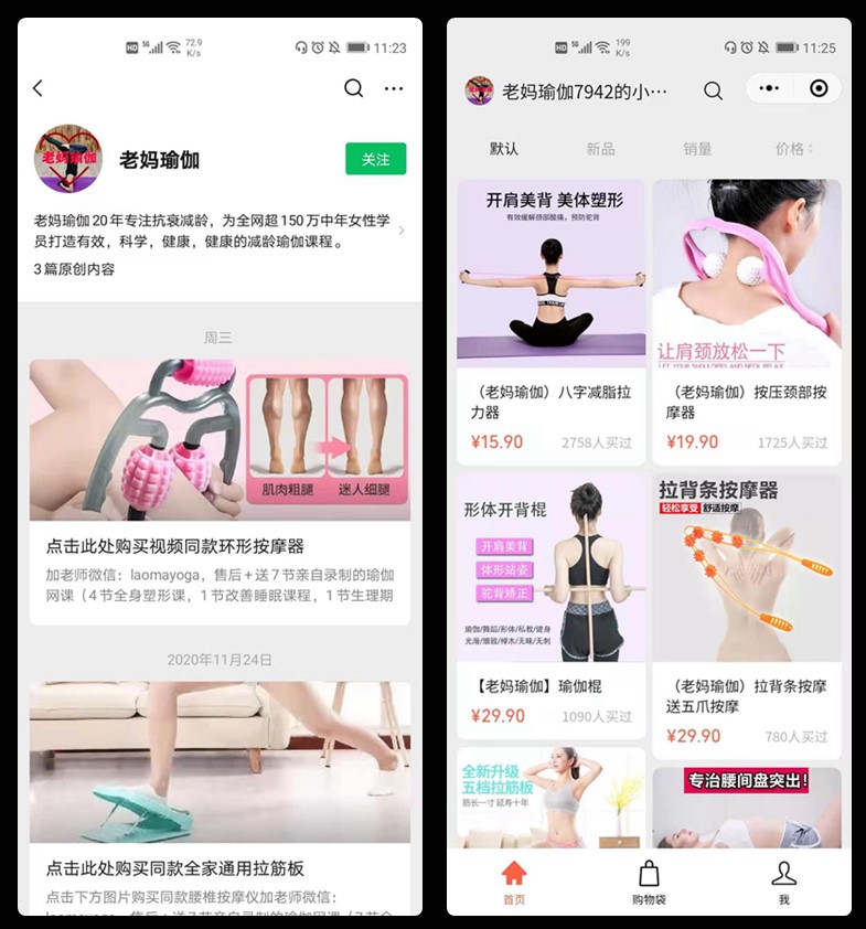 上文我们提到过,运动类视频要赚钱的话一般都是走健身瑜伽路线,原因这类型更容易通过带货的形式变现。【老妈抗衰瑜伽】变现方式就是直接视频底部挂链引流至公众号售卖视频中运动使用的同款商品。