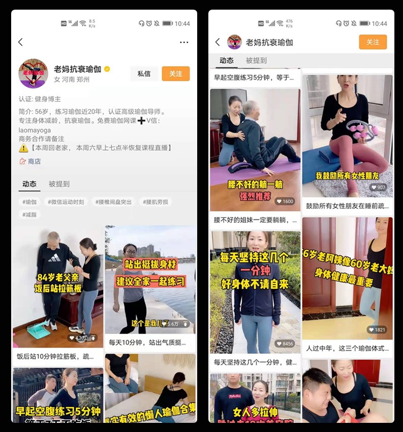 【老妈抗衰瑜伽】正是抓住这部分群体养生抗衰老需求,提供有针对性瑜伽以及运动知识内容,引起目标用户关注。