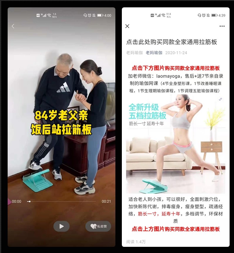 该账号最常用的手法就是,在视频中除了讲解运动小常识,还会用上一些运动辅助器材。比如在“84岁老父亲饭后站拉筋板”这个视频中,除了讲解饭后站立有利于健康外,还向用户展示了“拉筋板”的妙用,激发用户购买欲望。