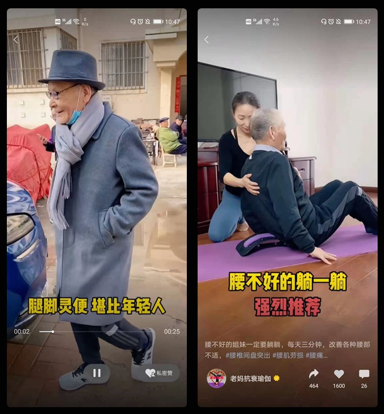 另外,该账号还会带着自己的儿子、学员以及年近90岁的老父亲一起出镜,做动作演示和讲解,比如经常展示老父亲健朗的形象,一起运动、做瑜伽动作,凸显其专业和可信度。