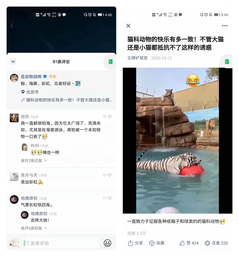选取的视频内容有很强观赏性,娱乐性也比较强,很容易博得用户关注,出爆款可能性比较大。从用户评论可以看到,很多人就是被这些宠物极为可爱和让人出乎意料的表现所吸引的。