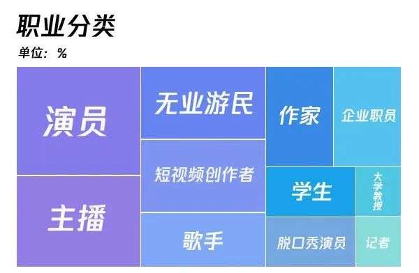 从下图中可以看出,30多位素人网红的职业非常多元,除了演员、主播和歌手以外,包括大学教师、记者、企业职员、作家等在内的各种职业都有成名的机会。