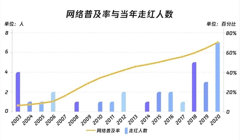 素人网红井喷与逐年提升的网络普及率