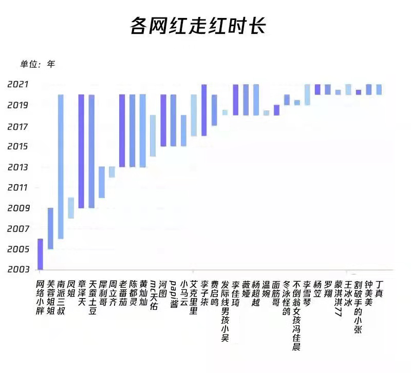 本期全媒派(ID:quanmeipai)对近二十年来的三十多位素人网红和他们的兴衰过程进行可视化分析,希望借此探讨素人网红们的走红“生命周期”和其一夜成名背后的一般性特征。