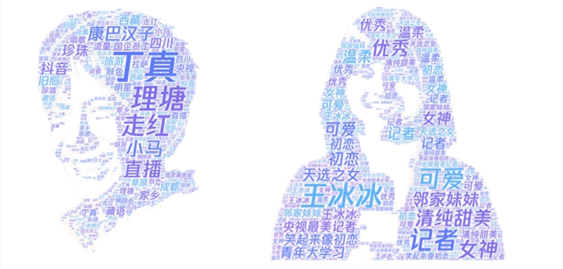 “最美记者”王冰冰的词云图充满了大量的赞美之词,像是“可爱”“清纯甜美”“邻家妹妹”等。此外,出现频率较高的“记者”“优秀”等评价,也呼应了网友不仅关注王冰冰甜美的外表,还认可她的业务能力。