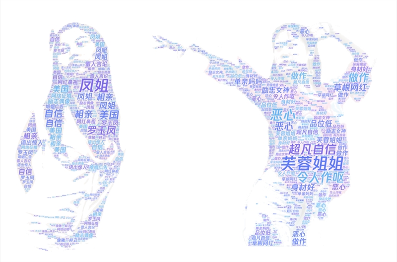 左为关于凤姐的评论词云图,右为关于芙蓉姐姐的评论词云图