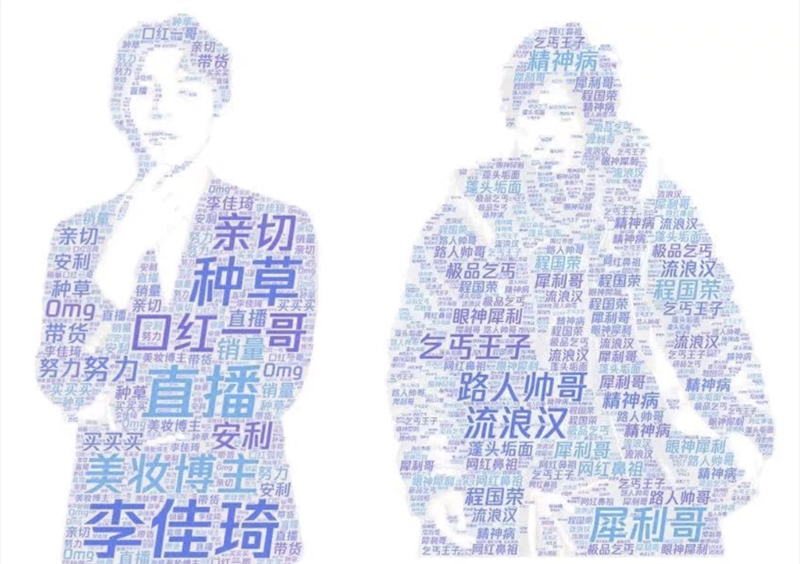 左为关于李佳琦的评论词云图,右为关于“犀利哥”的评论词云图