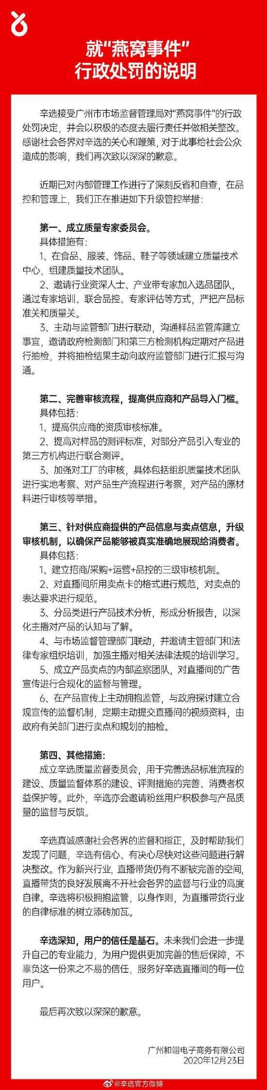 辛选官方微博发布声明称, 辛选接受广州市市场监督管理局对“燕窝事件”的行政处罚决定,并会以积极的态度去履行责任并做相关整改。