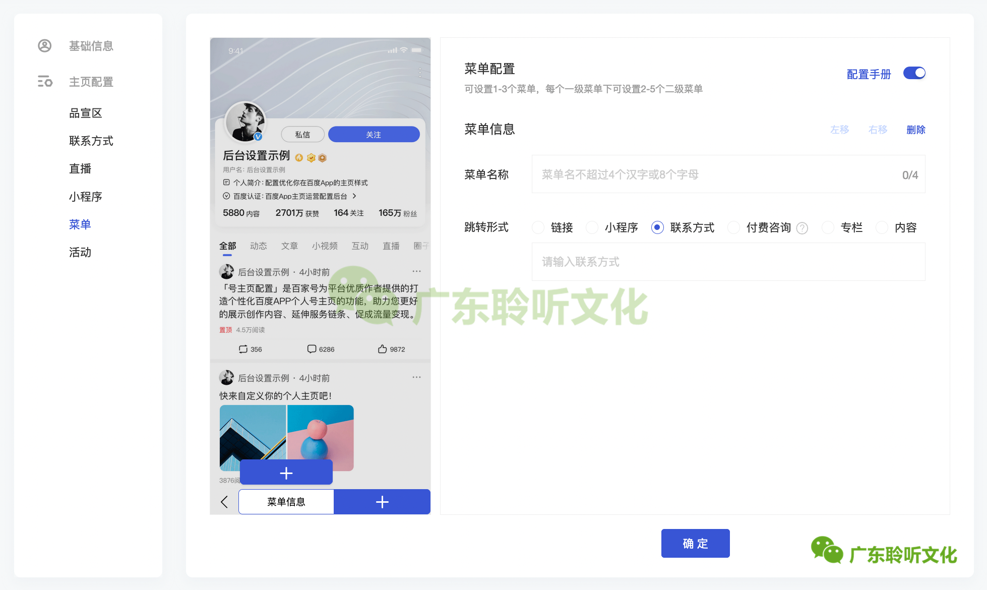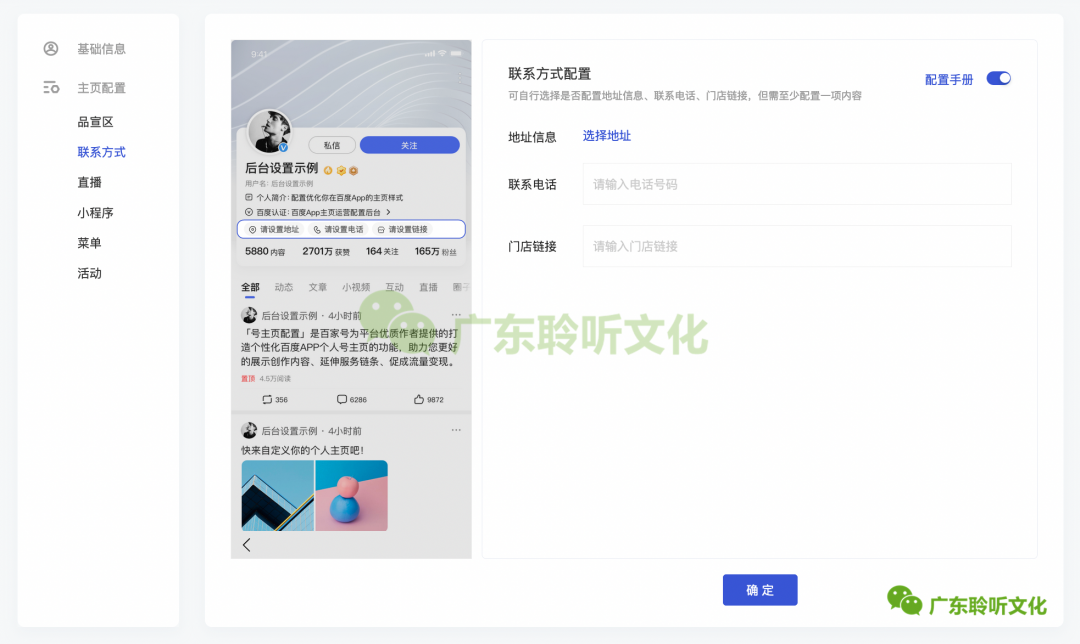 操作入口:百家号PC后台-「实验室」-「号主页配置」-「联系方式」。
