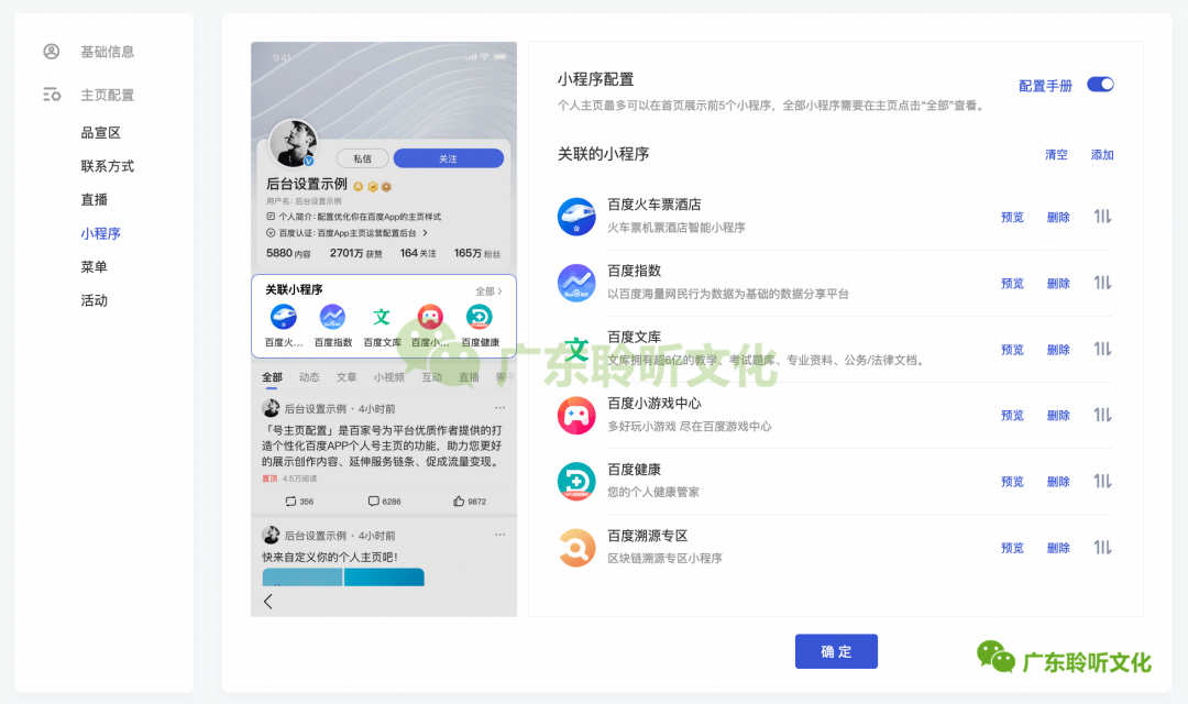 百家号蓝V主页的小程序关联区,支持添加非同主体小程序(过去仅支持同主体小程序),可对全部小程序进行添加、删除、排序、清空、预览操作,主页可最多展示5个小程序。此功能适合有商城、上门服务等小程序的企业商家,直接引流到小程序存留客户,再进行订单转化。