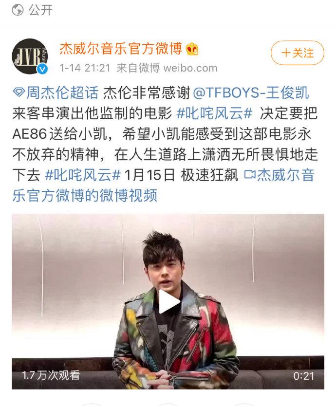 原来,周杰伦录制视频,为了感谢“小迷弟”王俊凯客串《叱咤风云》,承诺要把自己第一部电影《头文字D》里藤原拓海开的车AE86送给他。