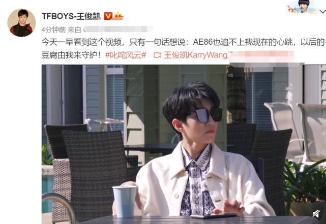 昨晚,王俊凯微博发布视频称:“今天一早看到这个视频,只有一句话想说:AE86也追不上我现在的心跳,以后的豆腐由我来守护!”