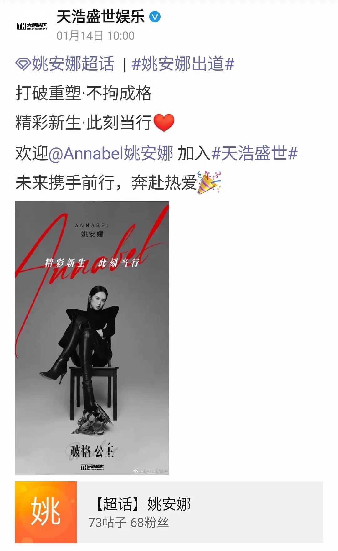 1月14日上午10点,天浩盛世娱乐公司官博发文,官宣华为千金姚安娜加盟,随后姚安娜转发此条微博,并配文写道:“对于自己的一份特殊的生日礼物,未来同行,不负热爱。”