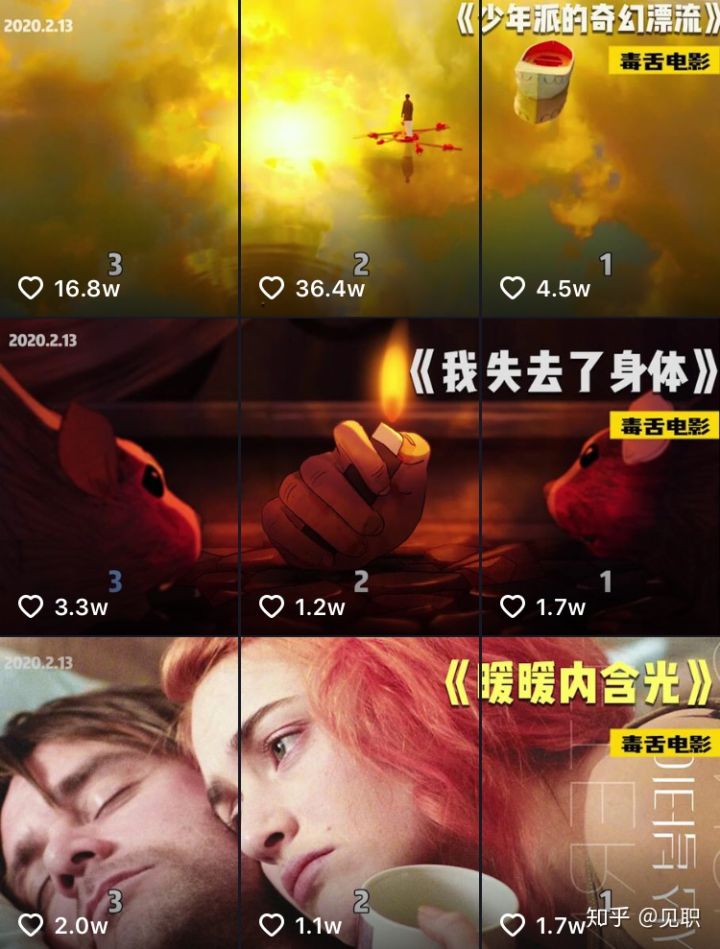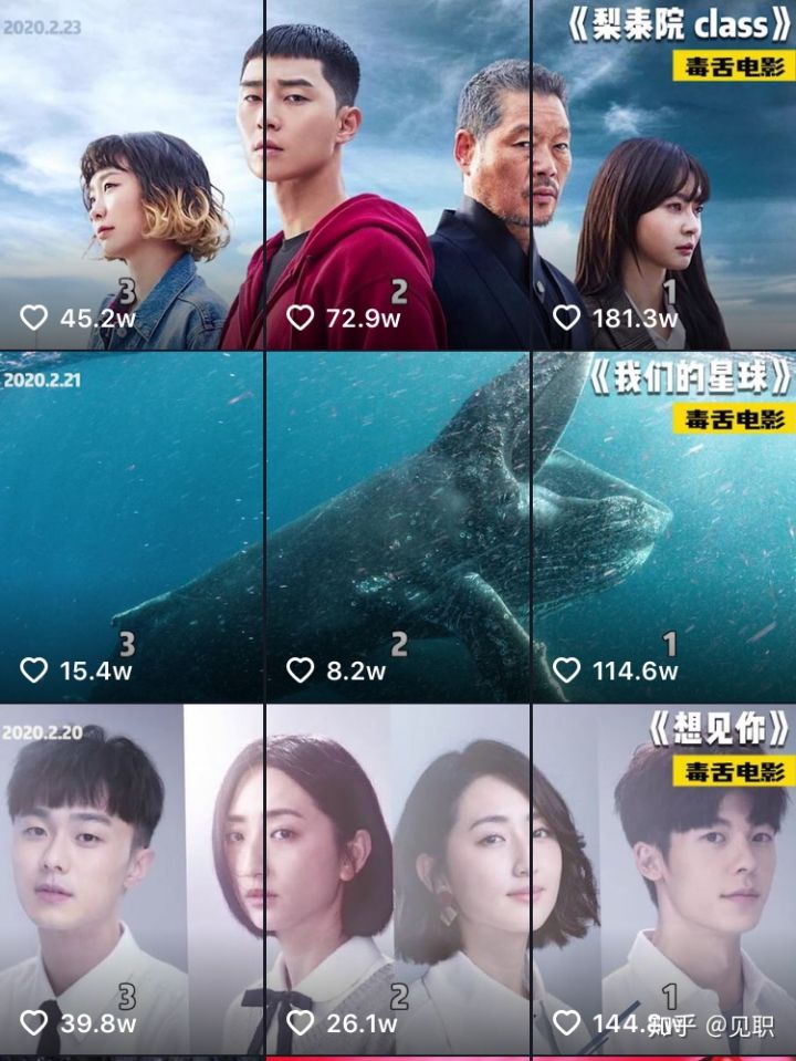 这类封面主要是针对电影解说方面的抖音账号。很多电影解说账号将三个视频的封面合在一起,做得非常好看,视觉的冲击力很强,简直像极了电影的宣传海报,看到封面就忍不住点击进去看看。
