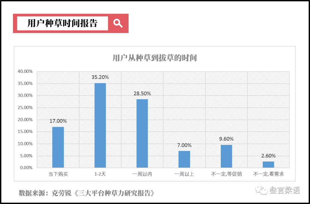 社交电商的来袭,让用户从种草到拔草的时间周期大大缩短,销售转化率得以提升。根据克劳锐的调研,67.8%的用户认为种草内容对选择商品并最终产生购买行为有很大的影响,74%的用户曾经购买过被种草的商品,80.7%的用户在被种草后会在一周内完成购买。