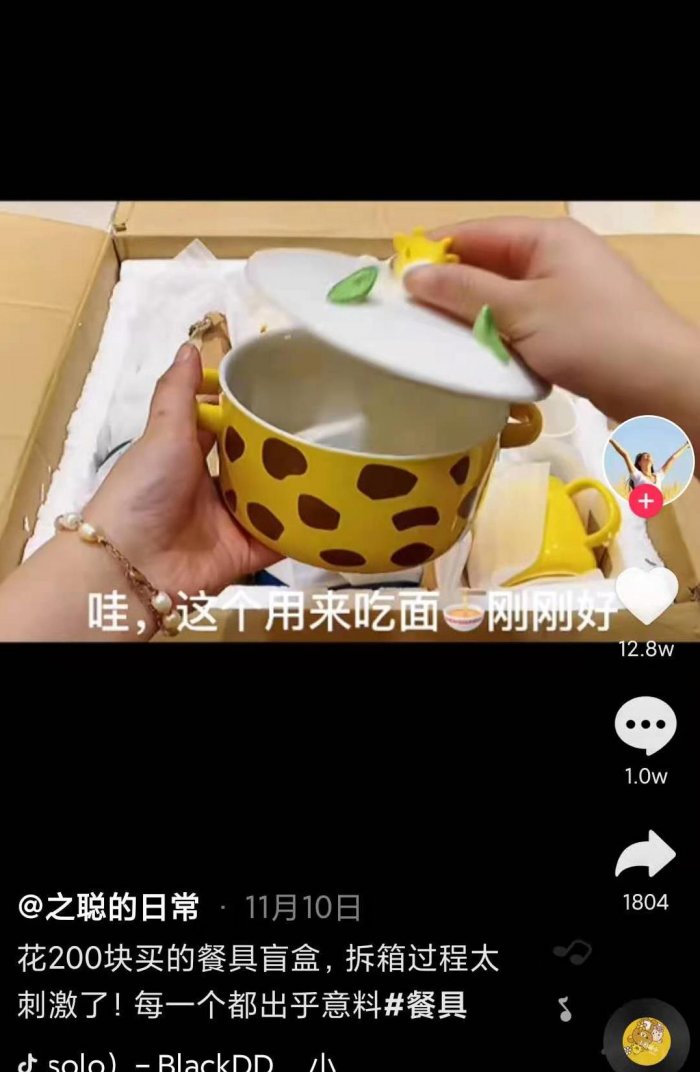 实拍开箱内容一直是很有市场的,像数码产品、手机、日常百货、新奇产品等开箱,在各大平台都是比较火爆的。抖音也不例外,比如说之前在抖音很火的拼多多碗碟盲盒开箱,吸引看不少用户去尝试。