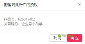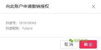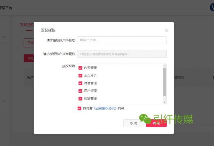 2. 在发起授权页面,输入母账号角色的抖音号,请确认抖音号的昵称和头像,避免错误授权。子帐号角色勾选想要赋予母帐号角色的管理权限,点击确定。系统会给母帐号角色发送确认通知。