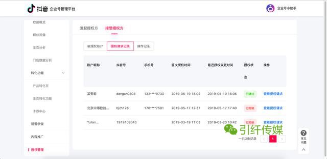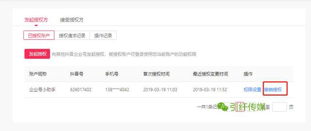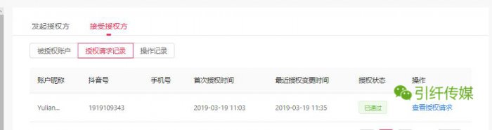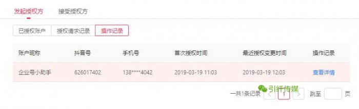 子母帐号角色均可查看母帐号角色对子帐号角色的操作记录。以子帐号角色为例,在【发起授权方】-【操作记录】下点击【查看详情】,便能看到母帐号角色对自己的操作记录。