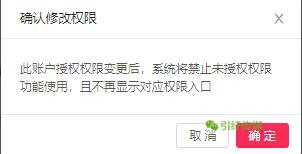 若子帐号角色想要修改授权给母帐号角色的权限内容,点击【发起授权方】-【已授权账户】-【权限设置】,选择需要保留的模块内容后,点击确定。母帐号角色会收到权限变更或取消的系统通知。