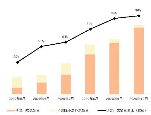 从2020年8月开始,随着抖音平台对第三方平台链接的限制和对抖音小店的政策倾斜,抖音小店占抖音平台销量比重迅速增长,已从5月的39%增加到10月的96%,几乎接近100%。