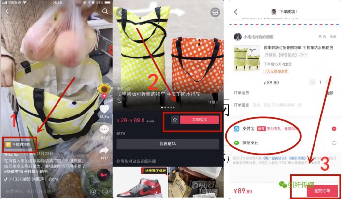 例:下图是顾客在抖音小店买商品操作流程,点击视频下方购物车,进入商品详情页面,选中商品属性就可以直接购买了,全程在抖音站内就可以完成,付款还可以选择微信支付。如果是淘宝店铺链接的话,就需要从抖音跳转至淘宝APP购买,减弱了消费者的购买热情。