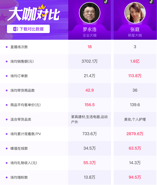 目前来看,张庭确实没有罗永浩出圈。要知道当时罗永浩在抖音直播首秀,抖音不仅给了 6000 万元签约费,还给到开屏广告、全部直播间植入开播信息等重磅资源,张庭在首播带货中算是自己悄无声息地完成了2. 56 亿的成绩,远大于 4 月 1 日,罗永浩首次直播的1. 6 亿元下单金额。从场均销售额来看,张庭的数据也一直大过罗永浩。