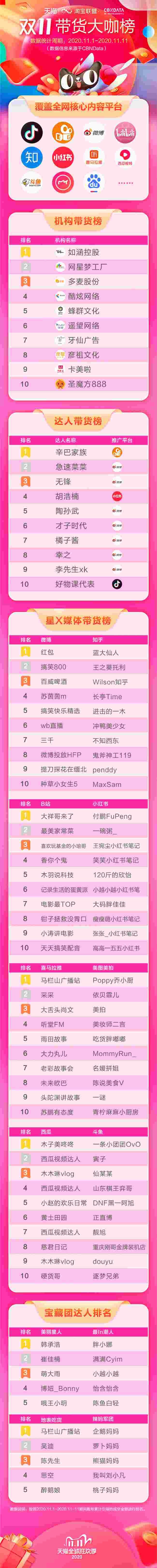 CBNDatax淘宝联盟联合发布的双11站外大咖带货榜显示,快手辛巴团队以“家族”的名义位居榜首。值得关注的还有一支新兴力量,淘宝联盟推出的宝藏团,作为首支电商团体和淘宝联盟生态中多样化典型角色的代表,这个近百人的带货达人团队在双11期间,为32万商家创造6.5亿价值。