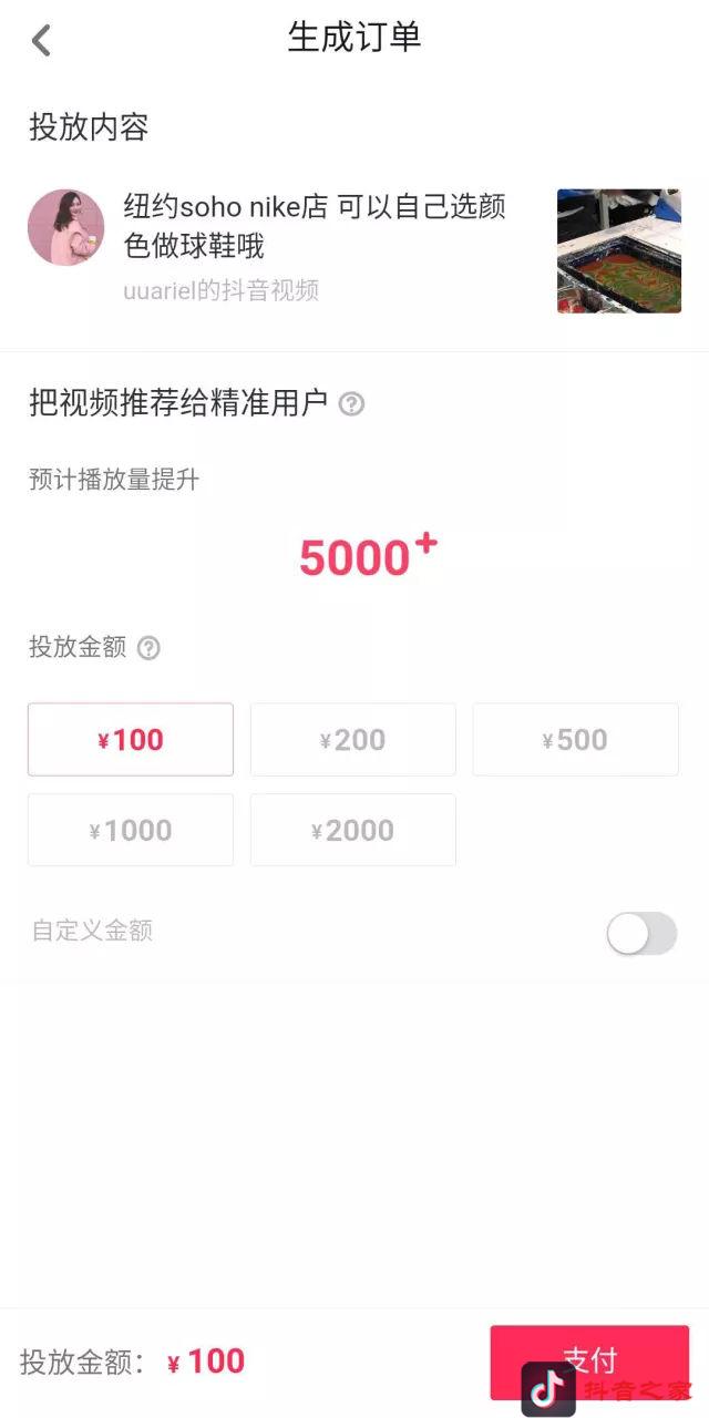 点开后即进入“生成订单”界面,可对想要加热的视频进行不同金额的投放。