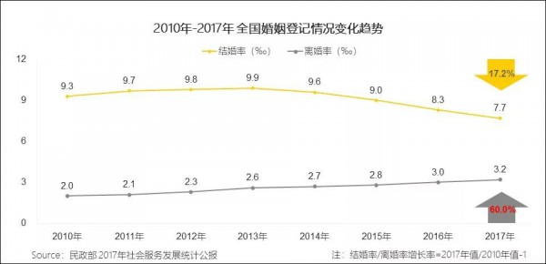 “恋爱”可以说是现阶段互联网用户的显著痛点之一,国家统计局《中国统计年鉴2018》告诉我们,2017年全国15岁及以上的单身人群达到2.15亿,且据民政部数据显示,我国结婚率已连续5年下降,离婚率已连续7年上升。受多方影响,我国“超单身社会”的进程在不断向前推进。