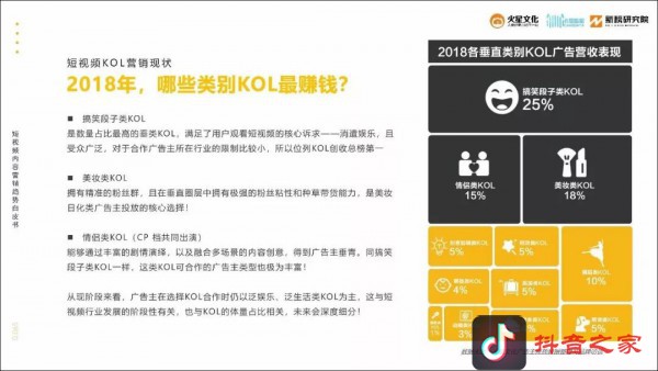 据卡思数据《2019年短视频内容营销趋势白皮书》显示,2018年,情侣类KOL的广告营收表现占到所有垂类的15%,仅次于搞笑段子类、美妆类KOL。