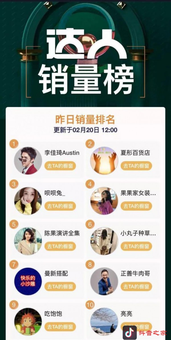 在2月20号的抖音达人销量榜上,我们发现:李佳琦再次获得榜首桂冠。销量第一的他,不仅带货能力强,还是美妆榜单的TOP1。
