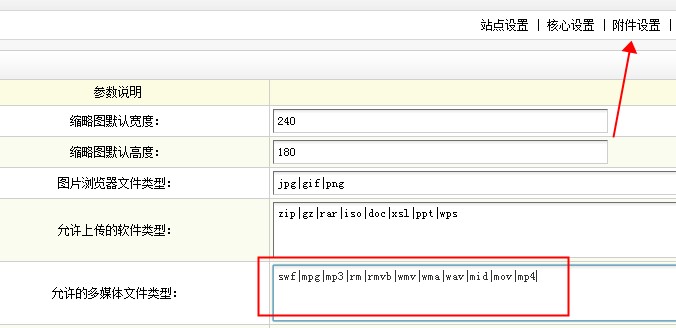 一、后台系统设置 上传附件 添加MP4格式(首先要让后台支持mp4格式文件上传),如图所示