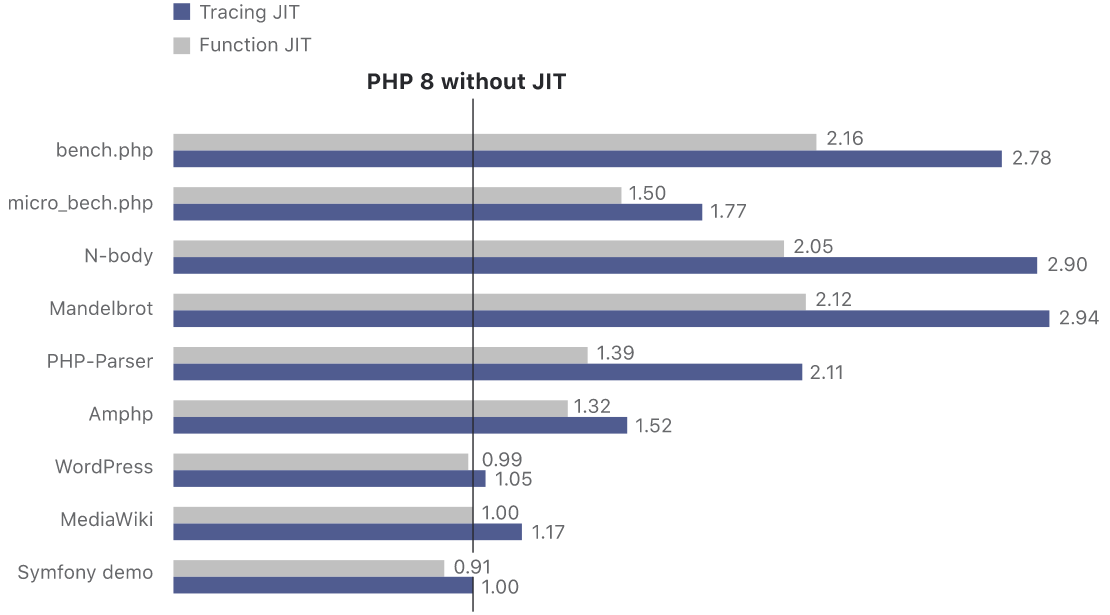 此次版本最大的亮点是JIT(Just-In-Time,即时编译),JIT 是一种编译器策略,它将代码表述为一种中间状态,在运行时将其转换为依赖于体系结构的机器码,并即时执行。在 PHP 中,这意味着 JIT 将为 Zend VM 生成的指令视为中间表述,并以依赖于体系结构的机器码执行,也就是说托管代码的不再是 Zend VM,而是更为底层的 CPU。