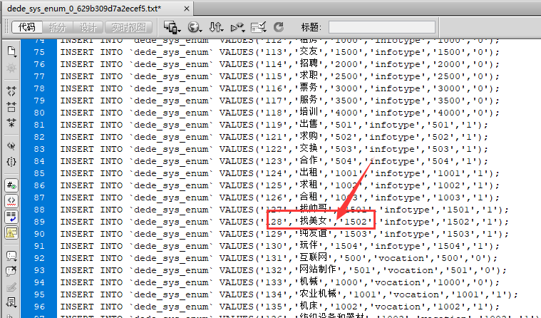 第二步在数据文件也可能出现,路径是 data/backupdata/dede_sys_enum_0_629b309d7a2ecef5.txt的这个文件打开查找会发现(如图)
