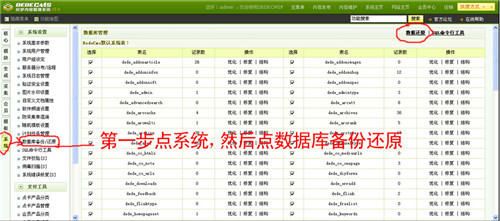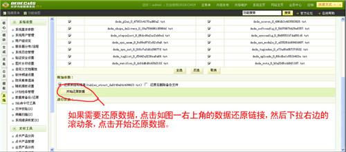 数据备份完毕后系统会提示,备份好数据我们最好是将数据下载到本地电脑存放着比较保险,打开FTP软件,连接到网站所在空间,找到data文件夹,将data文件夹下的backupdata整个文件夹下载到本地电脑里,接着返回根目录,找到uploads文件夹,将uploads文件夹下的allimg整个文件夹下载到本地电脑里。保存这两个文件夹就可以了。如果要还原数据,就用FTP软件将这两个文件夹上传到原来的地方覆盖,接着登入后台按下图操作。