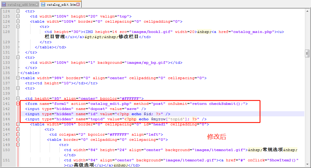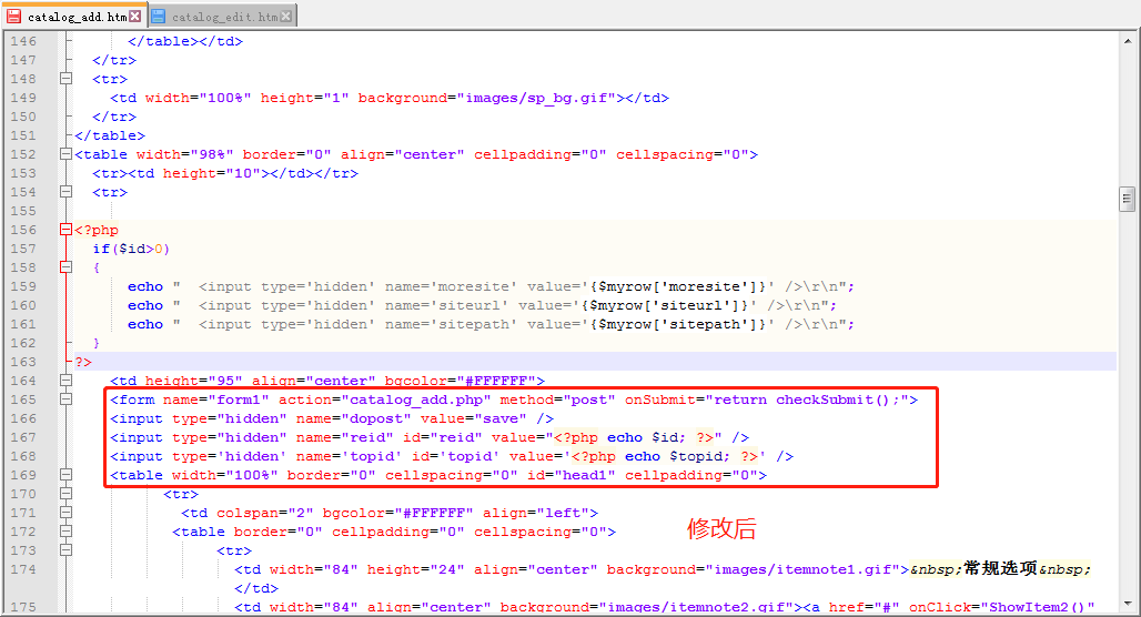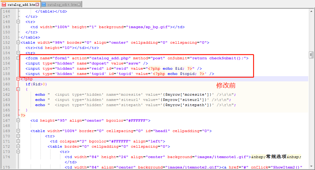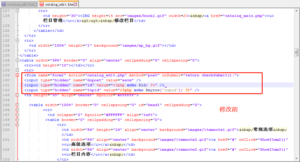 二、在catalog_edit.htm大概139行修改form表单位置,把form开头部分放在td内: