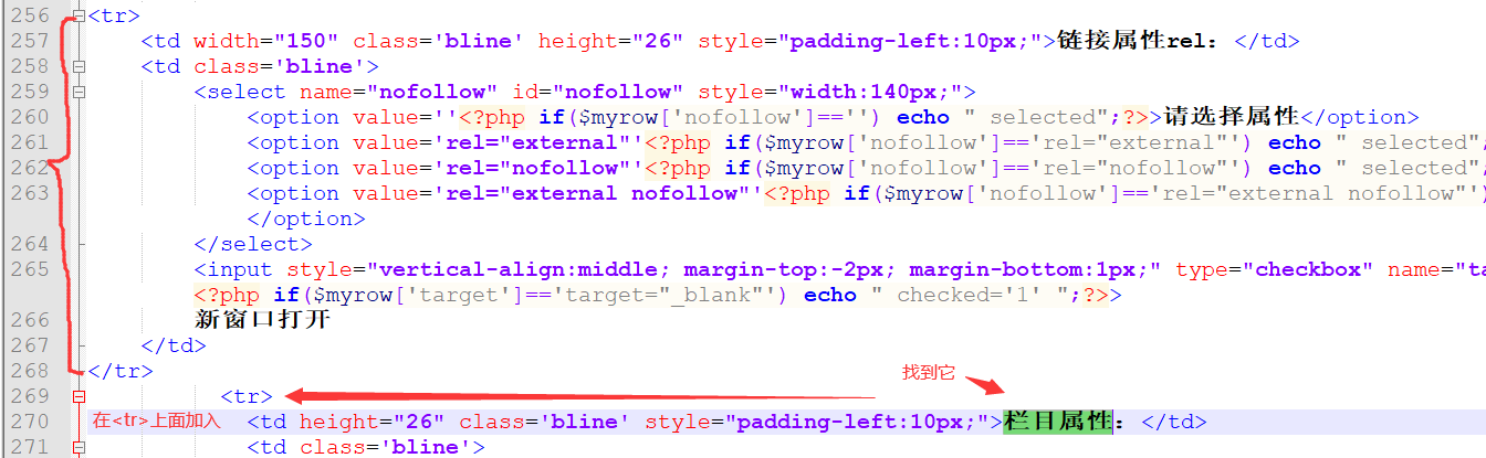 <tr> <td width="150" class='bline' height="26" style="padding-left:10px;">链接属性rel:</td> <td class='bline'> <select name="nofollow" id="nofollow" style="width:140px;"> <option value=''<?php if($myrow['nofollow']=='') echo " selected";?>>请选择属性</option> <option value='rel="external"'<?php if($myrow['nofollow']=='rel="external"') echo " selected";?>>external</option> <option value='rel="nofollow"'<?php if($myrow['nofollow']=='rel="nofollow"') echo " selected";?>>nofollow</option> <option value='rel="external nofollow"'<?php if($myrow['nofollow']=='rel="external nofollow"') echo " selected";?>>external nofollow</option> </select> <input style="vertical-align:middle; margin-top:-2px; margin-bottom:1px;" type="checkbox" name="target" value='target="_blank"' class="np"<?php if($myrow['target']=='target="_blank"') echo " checked='1' ";?>> 新窗口打开 </td> </tr> |