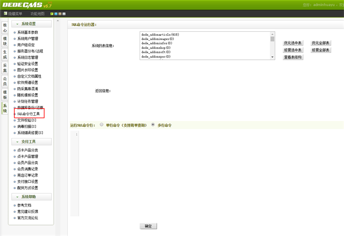 用织梦的朋友都知道,如果需要对数据库进行批量操作,可以用织梦后台【系统】-【sql命令行工具】实现。其实这只是织梦系统为了大家操作方便,提供的一个对mysql数据库操作的工具,这样大家在需要批量操作数据库时候可在后台直接操作。但是大家在操作数据库时候一定要小心,最好是先做好数据库备份,以免发生未知错误。