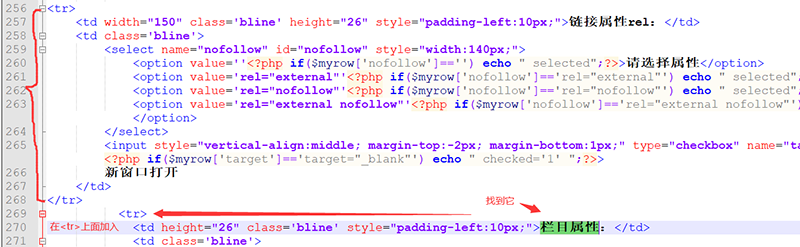 <tr> <td width="150" class='bline' height="26" style="padding-left:10px;">链接属性rel:</td> <td class='bline'> <select name="nofollow" id="nofollow" style="width:140px;"> <option value=''<?php if($myrow['nofollow']=='') echo " selected";?>>请选择属性</option> <option value='rel="external"'<?php if($myrow['nofollow']=='rel="external"') echo " selected";?>>external</option> <option value='rel="nofollow"'<?php if($myrow['nofollow']=='rel="nofollow"') echo " selected";?>>nofollow</option> <option value='rel="external nofollow"'<?php if($myrow['nofollow']=='rel="external nofollow"') echo " selected";?>>external nofollow</option> </select> <input style="vertical-align:middle; margin-top:-2px; margin-bottom:1px;" type="checkbox" name="target" value='target="_blank"' class="np"<?php if($myrow['target']=='target="_blank"') echo " checked='1' ";?>> 新窗口打开 </td> </tr> |