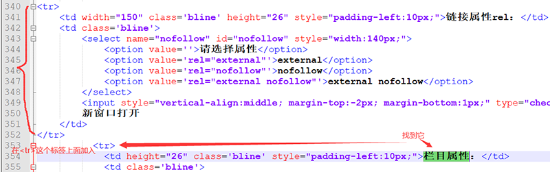 <tr> <td width="150" class='bline' height="26" style="padding-left:10px;">链接属性rel:</td> <td class='bline'> <select name="nofollow" id="nofollow" style="width:140px;"> <option value=''>请选择属性</option> <option value='rel="external"'>external</option> <option value='rel="nofollow"'>nofollow</option> <option value='rel="external nofollow"'>external nofollow</option> </select> <input style="vertical-align:middle; margin-top:-2px; margin-bottom:1px;" type="checkbox" name="target" value='target="_blank"' class="np"> 新窗口打开</td></tr> |