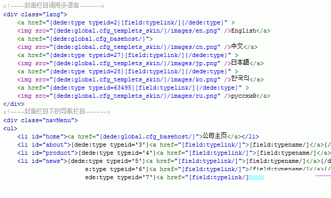 每种语言的封面栏目和每种语言下的导航栏目都是单独调用的,用{dede:type typeid='*'}单独调用,请看图