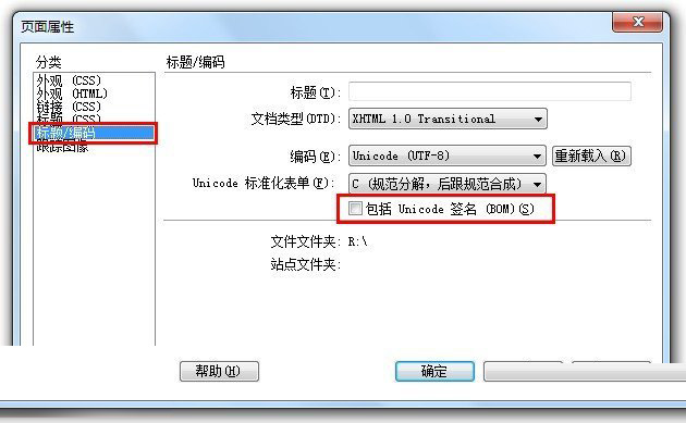 打开页面属性后,找到“标题/编码”,然后再找到“包含Unicode签名(BOM)”,把前面的勾勾掉,然后保存,再上传到服务器上就可以了。
